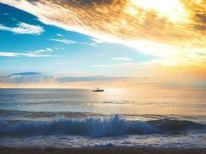 A fishing charter goes out during sunrise
